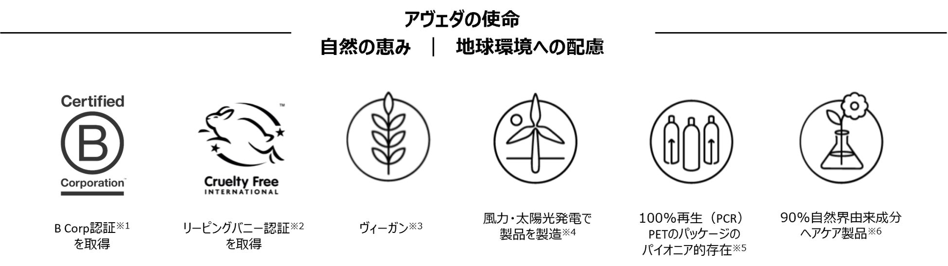 ※2 リーピングバニー認証とは、クルエルティフリー・インターナショナルによって、製品開発~製造工程で動物実験を行っていないブランドに付与される、国際的に認められている最高水準の認証です。 ※3 動物実験も行わず、動物由来成分も使いません。 ※4 製品の製造には、(米国の)再生可能エネルギークレジットやカーボンオフセットを通じてアヴェダの太陽電池や風力エネルギーによる電力が供給されています。更に、工場施設において、2023年末までに、ULスキームによるごみ廃棄場のシルバーゼロ ウェイスト認証を取得できるよう取り組んでいます。※5 85%以上のスキンケアおよびヘアスタイリングのPETパッケージとジャー容器は再生(PCR)PETを100%使用しています。 またアヴェダは美容業界において、100%再生(PCR)PETパッケージを採用した初めての化粧品会社です。
