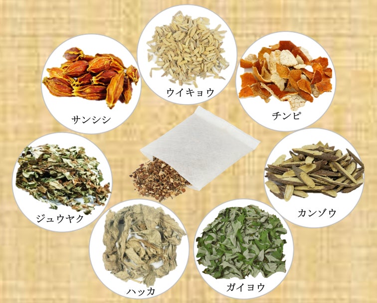 <共通>有効成分:陳皮(チンピ)、山梔子(サンシシ)、艾葉(ガイヨウ)、甘草(カンゾウ)、茴香(ウイキョウ)、薄荷(ハッカ)、十薬(ジュウヤク)