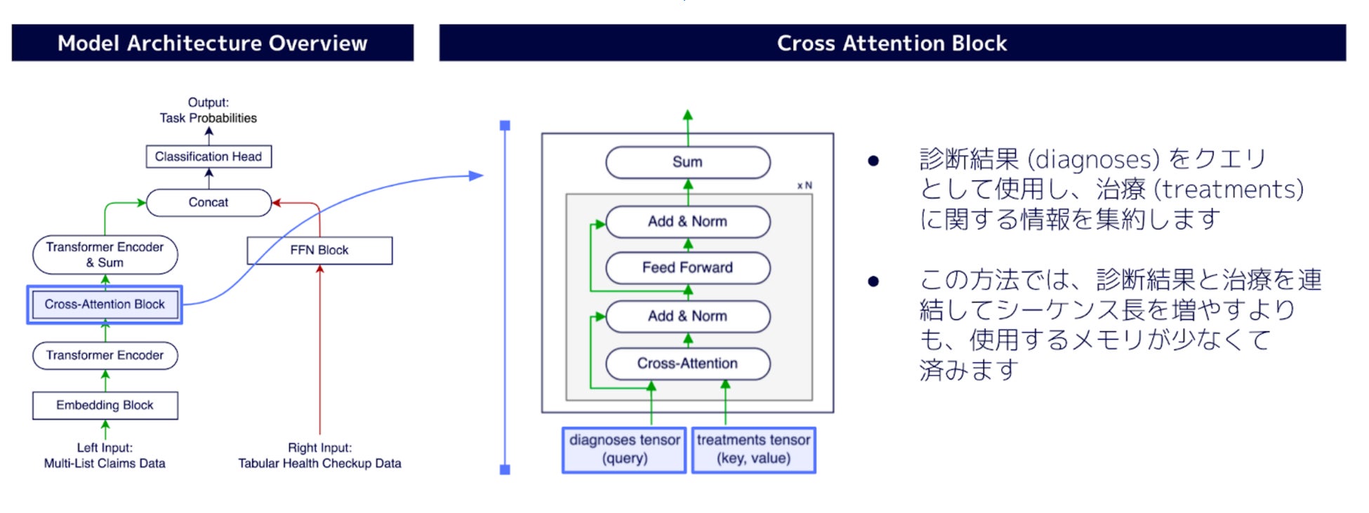 全国規模の保険者のレセプトデータ (2014 年 4 月 ~ 2022 年 3 月診療分) を利用し、主要心血管疾患(MACE)の予測モデルの性能を向上させることを目的としました。心筋梗塞や脳血管疾患、心不全、末梢動脈疾患などの複合疾患であるMACEは世界的に主要な死因であり、予防は喫緊の課題です。私たちは、診断と治療の関係を効果的に重み付けして予測に活用するために、Cross Attention メカニズムを応用しました。具体的には、レセプトデータに含まれる診断と治療の月次データを Transformer Encoder を用いて変換し、その後 Cross Attention を用いて診断と治療の相互関係を反映した特徴ベクトルを作成しました。これと健康診断の検査値データを統合し、MACEを予測する新たな予測モデル*3を構築しました。