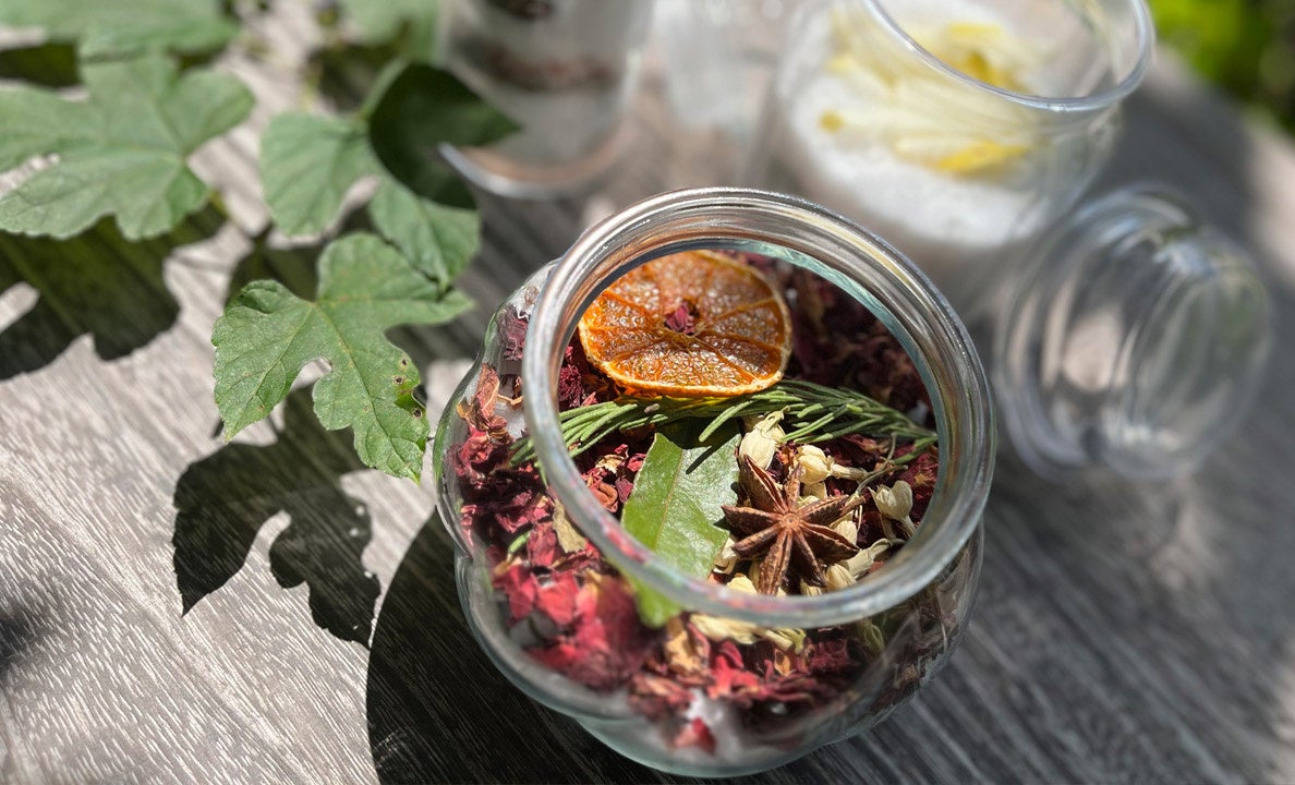 良い香りは気を巡らせます。お塩とハーブ(生薬)や季節のお花を組み合わせて、オリジナルのモイストポプリをつくります。デコレーション次第で、見た目も可愛くお洒落につくることも。花茶を味わいながら、香りの効能もお伝えします。自分に合った自然な香りに癒されましょう。バスソルトとしても楽しめます!