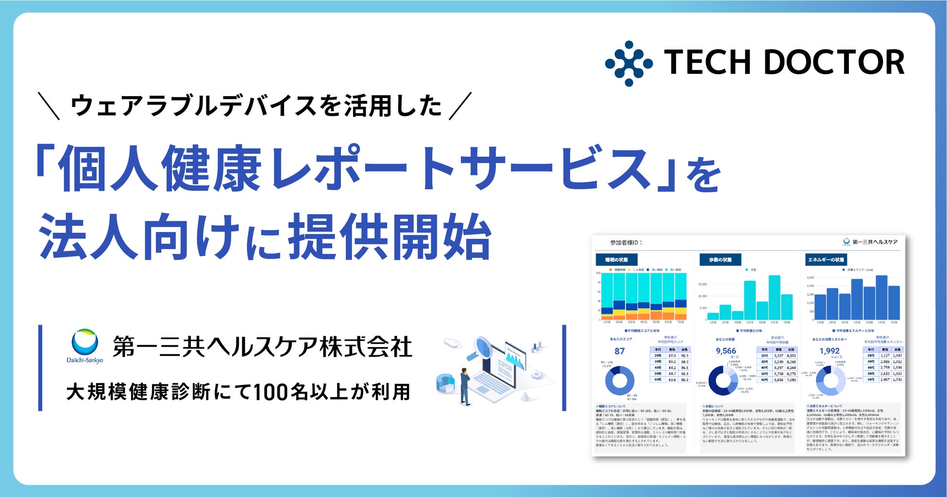 株式会社テックドクター(代表取締役:湊 和修、本社:東京都中央区、以下、テックドクター)は、ウェアラブルデバイスのGoogle Fitbitを活用した「個人健康レポートサービス」を法人向けに提供開始しました。本サービスは、企業や自治体などの組織に属する個人の健康データを可視化し、個々のユーザーにとってわかりやすい形で提供します。企業や自治体などの組織でご利用いただくことで、健康管理や健康増進施策を効果的にサポートします。