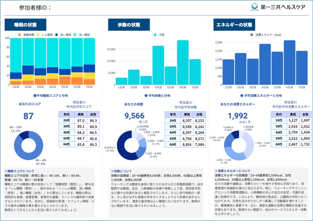 このサービスはすでに第一三共ヘルスケア株式会社が参画する大規模健康診断で導入され、100名以上の受診者がウェアラブルデバイスを活用した取り組みに参加しています。個人レポートによるデータの可視化と比較を通じて、参加者の健康意識の向上を目指しています。