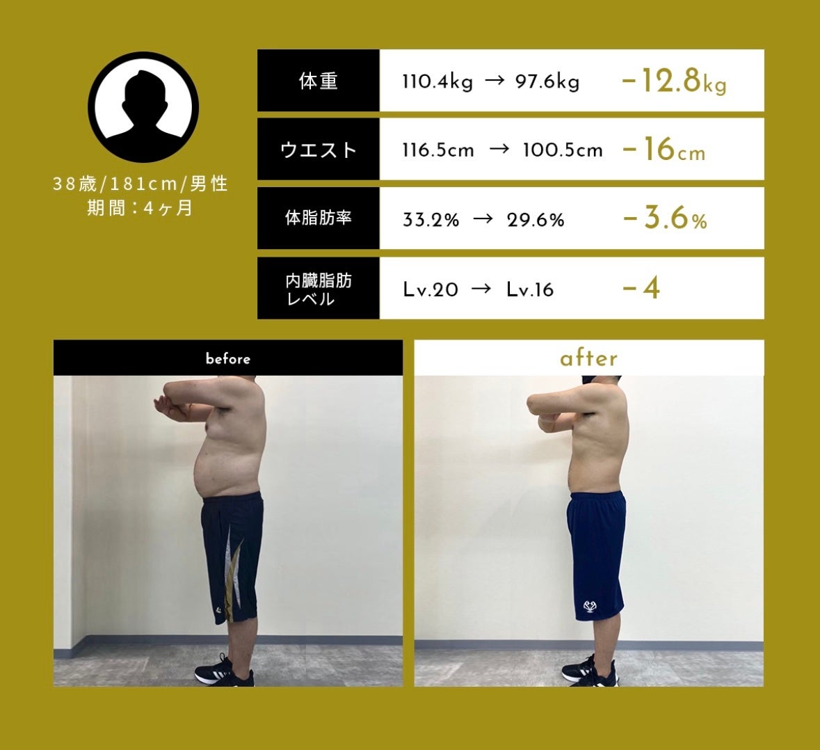 その結果、体重は-12.8kg、数値面も全て標準まで改善されました。