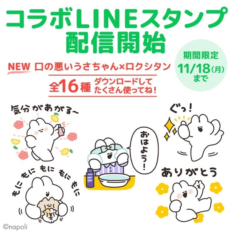 期間限定!「口の悪いうさちゃん」とロクシタンのコラボLINEスタンプが初登場!ゆるくてかわいいLINEスタンプは全16種♪ロクシタンLINE公式アカウントと友だちになるともらえるよ!