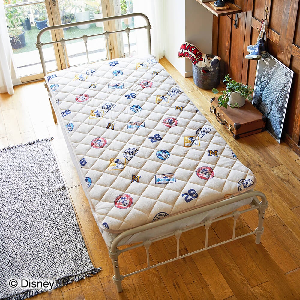 古着のようなワッペンデザインのプリントをやわらかい色味で散りばめたパッドシーツ。
