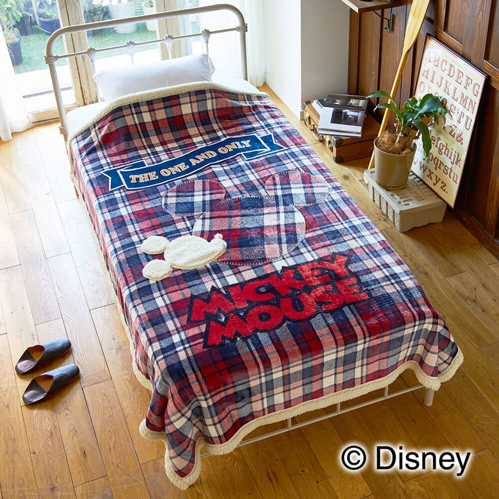 あたたかなボアの立体的なミッキーがかわいい、ミッキーらしい明るいチェック柄毛布。