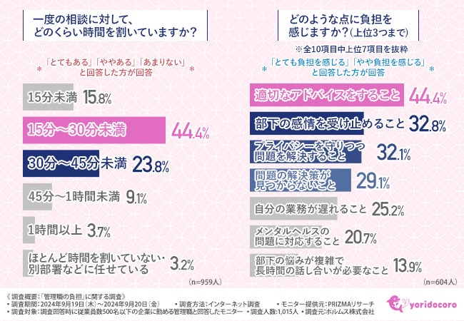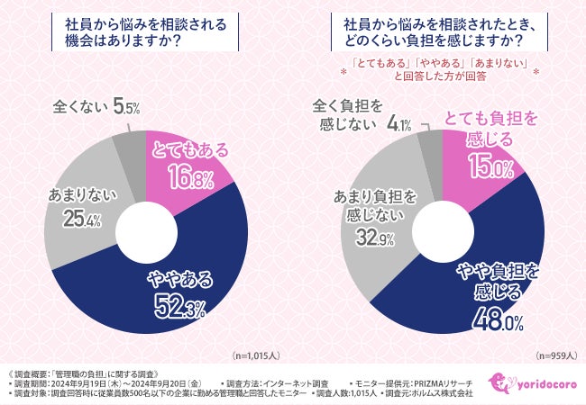 企業の管理職は、部下の指導や業務の効率化、社内調整などさまざまな業務に追われていますが、社員からの相談事や部下のマネジメントは特に頭を悩ませる業務ではないでしょうか。『yoridocoro(よりどころ)for Team』(https://yoridocoro.link/team/)を行うポルムス株式会社は、従業員数500名以下の企業に勤める管理職を対象に「管理職の負担」に関する調査を実施しました。