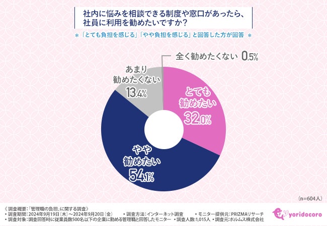 最後に「社内に悩みを相談できる制度や窓口があったら、社員に利用を勧めたいですか?」と質問したところ、『とても勧めたい(32.0%)』『やや勧めたい(54.1%)』『あまり勧めたくない(13.4%)』『全く勧めたくない(0.5%)』という回答結果になりました。