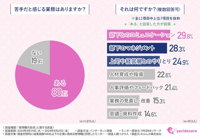 一方で、8割以上の方が苦手な業務があると回答しており、その内容として「部下や上司とのコミュニケーション」や「マネジメント業務」といった社内における対人関係に、苦手意識を持つ管理職が多いことが明らかとなっています。