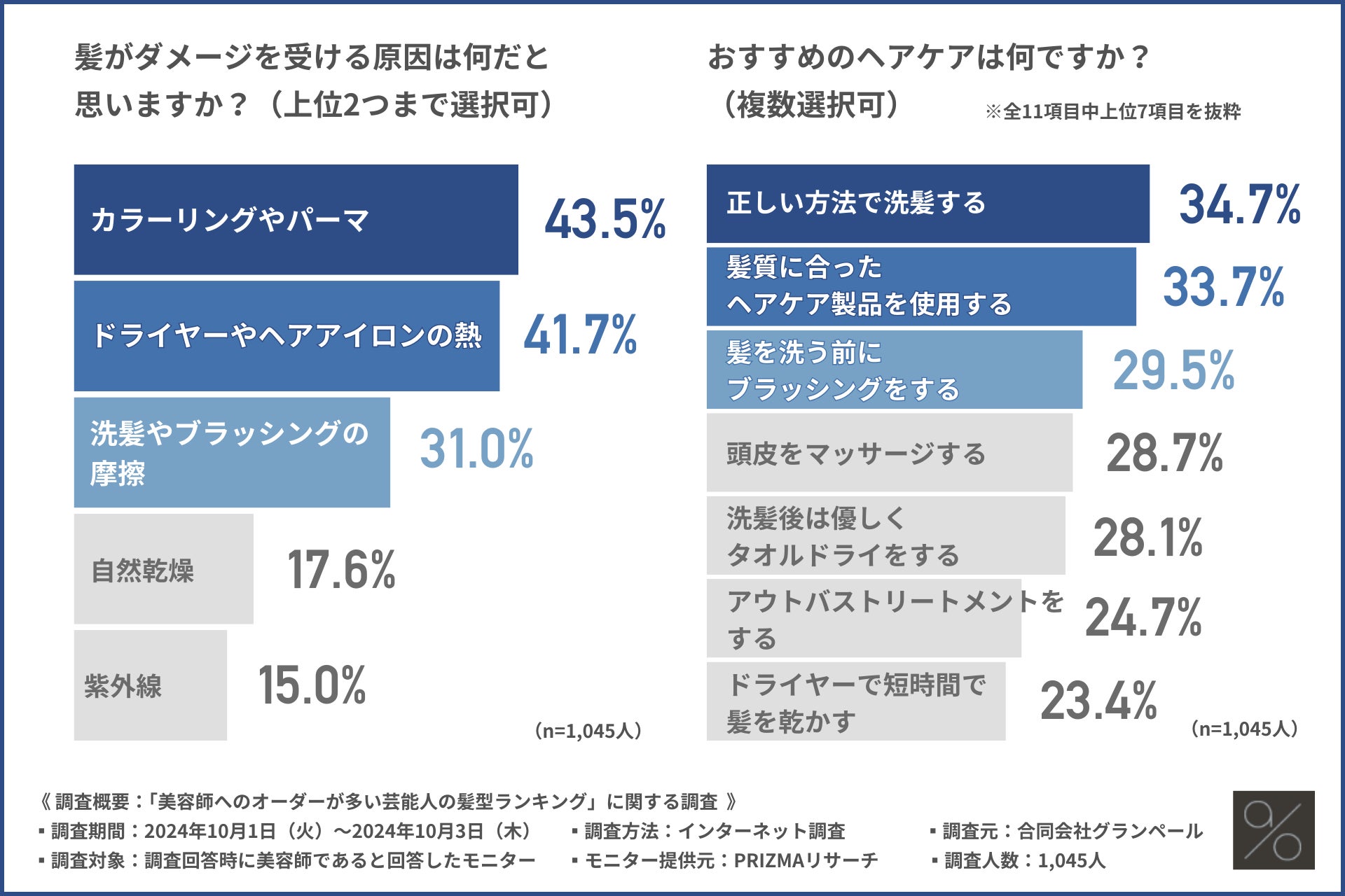 髪にダメージを与える主な原因としては「カラーリングやパーマ」「ドライヤーやヘアアイロンの熱」「洗髪やブラッシングの摩擦」が挙げられました。こうしたダメージを防ぐために、「正しい方法での洗髪」「髪質に合ったヘアケア製品の使用」「髪を洗う前のブラッシング」が効果的とされています。