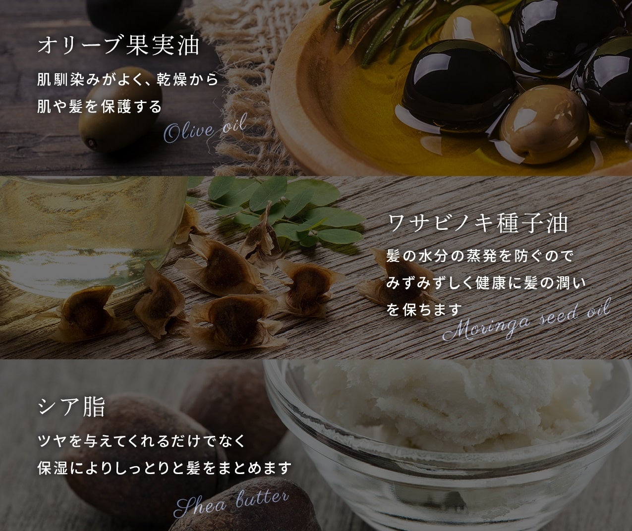 髪の外側からコーティングする鉱物性油ではなく、髪の内側から補整する天然植物性油のみを使用することにしました。