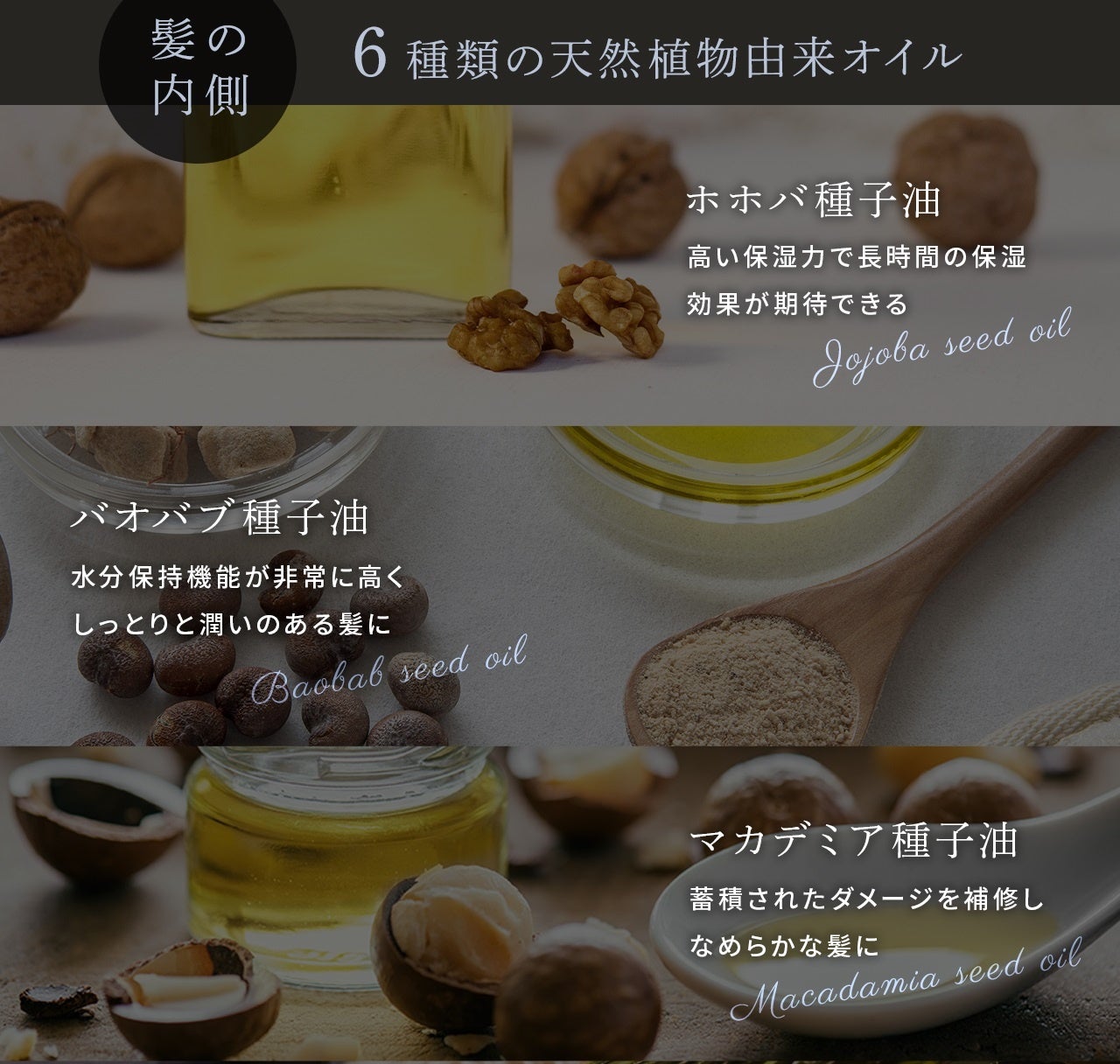 剛毛に効く保湿力や保護力が高いオイルを、65種の中から6種を厳選して使用(ホホバ種子油、バオバブ種子油、マカデミア種子油、オリーブ果実油、ワサビノキ種子油、シア脂)