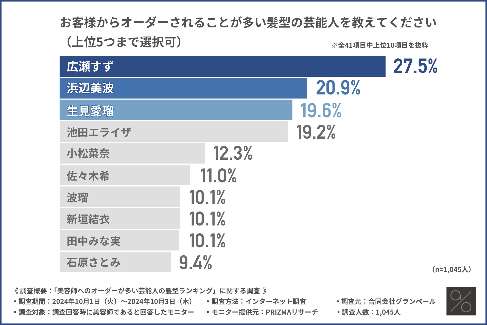 合同会社グランペール(本社所在地:東京都中野区)は、美容師を対象に、「美容師へのオーダーが多い芸能人の髪型ランキング」に関する調査を実施しました。