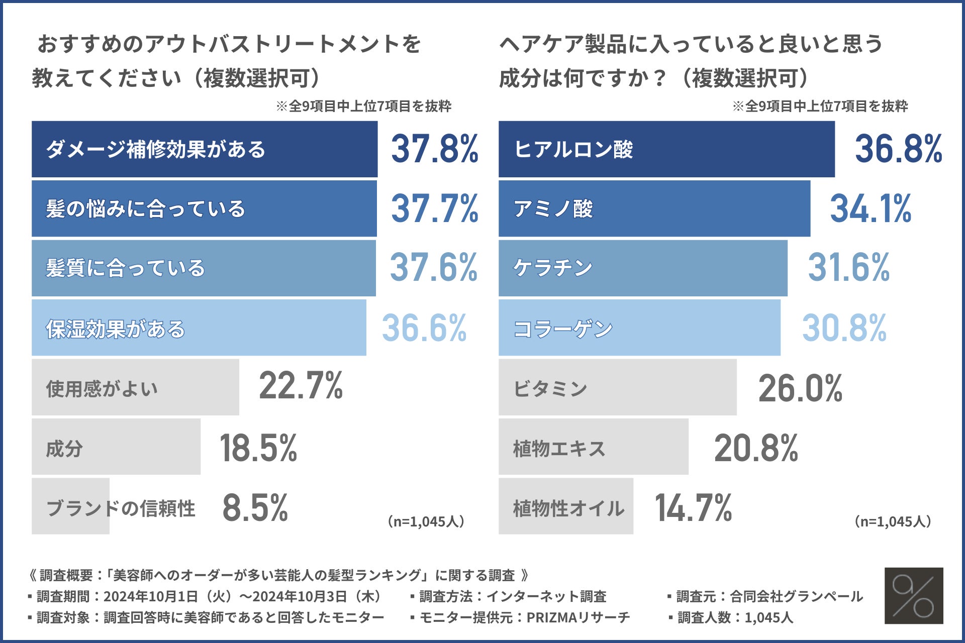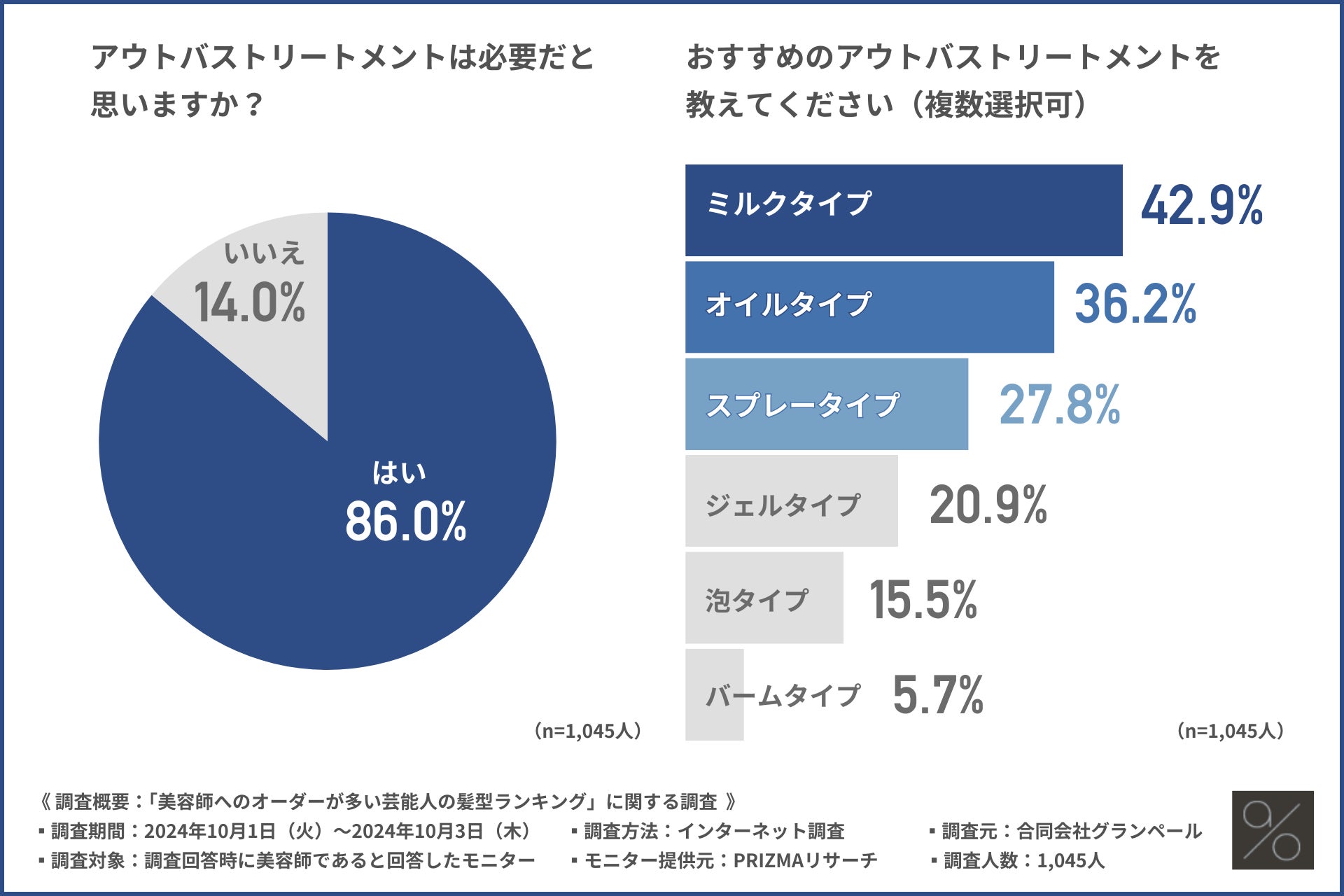 さらに、8割以上の美容師がアウトバストリートメントの必要性を感じており、中でも「ミルクタイプ」の製品は髪の水分を閉じ込め、外的要因から守るためにおすすめされています。「オイルタイプ」や「スプレータイプ」も高い人気を集めています。