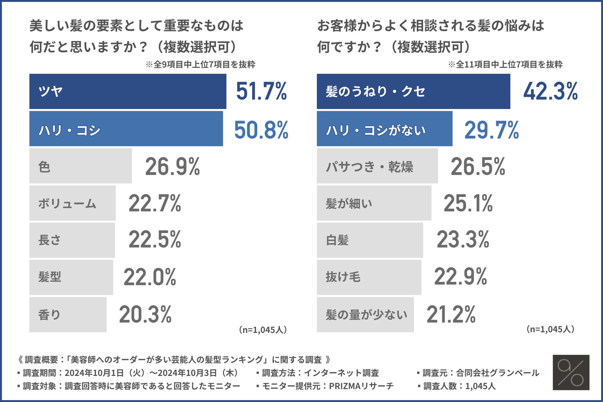 また、美容師たちが美しい髪の要素として重視しているのは「ツヤ」と「ハリ・コシ」ですが、お客様からは「髪のうねり・クセ」「ハリ・コシ不足」「パサつき・乾燥」といった悩みがよく相談されているようです。