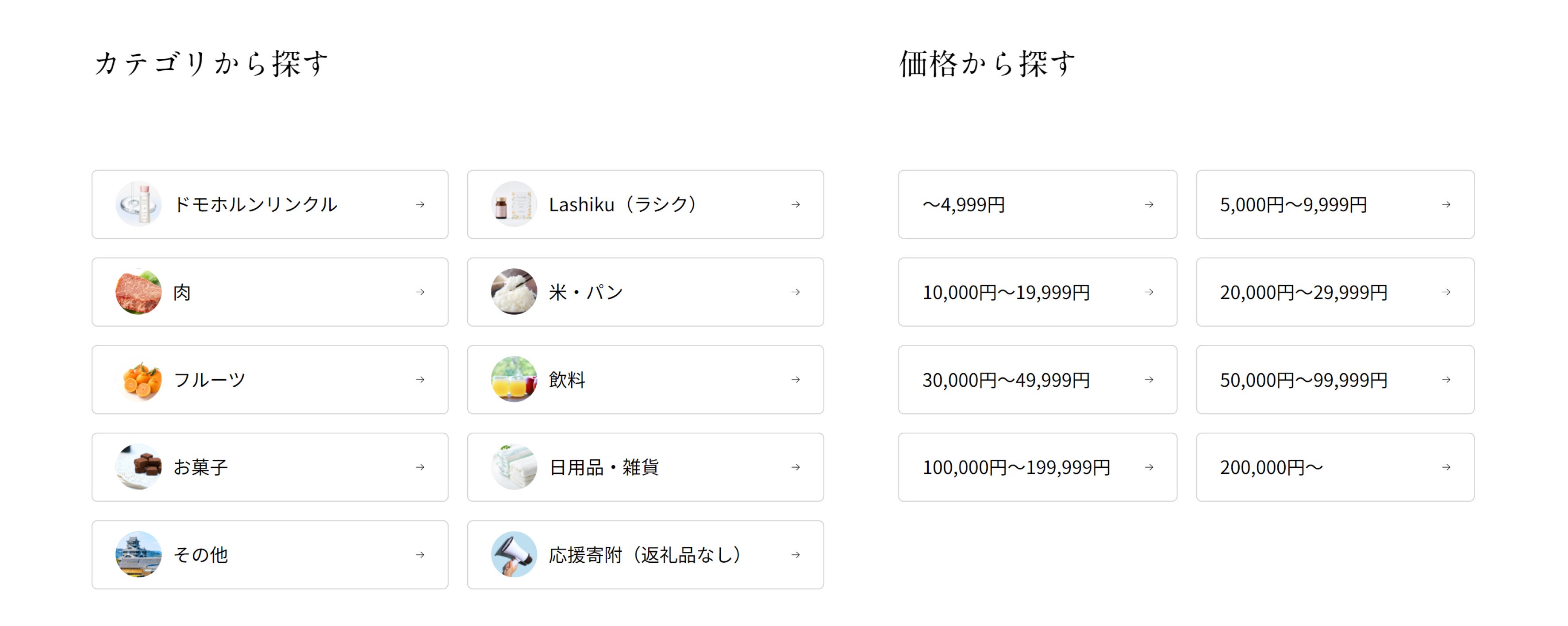 さらに、ページの下部にはカテゴリや価格帯から返礼品をセレクトできるように配置されています。