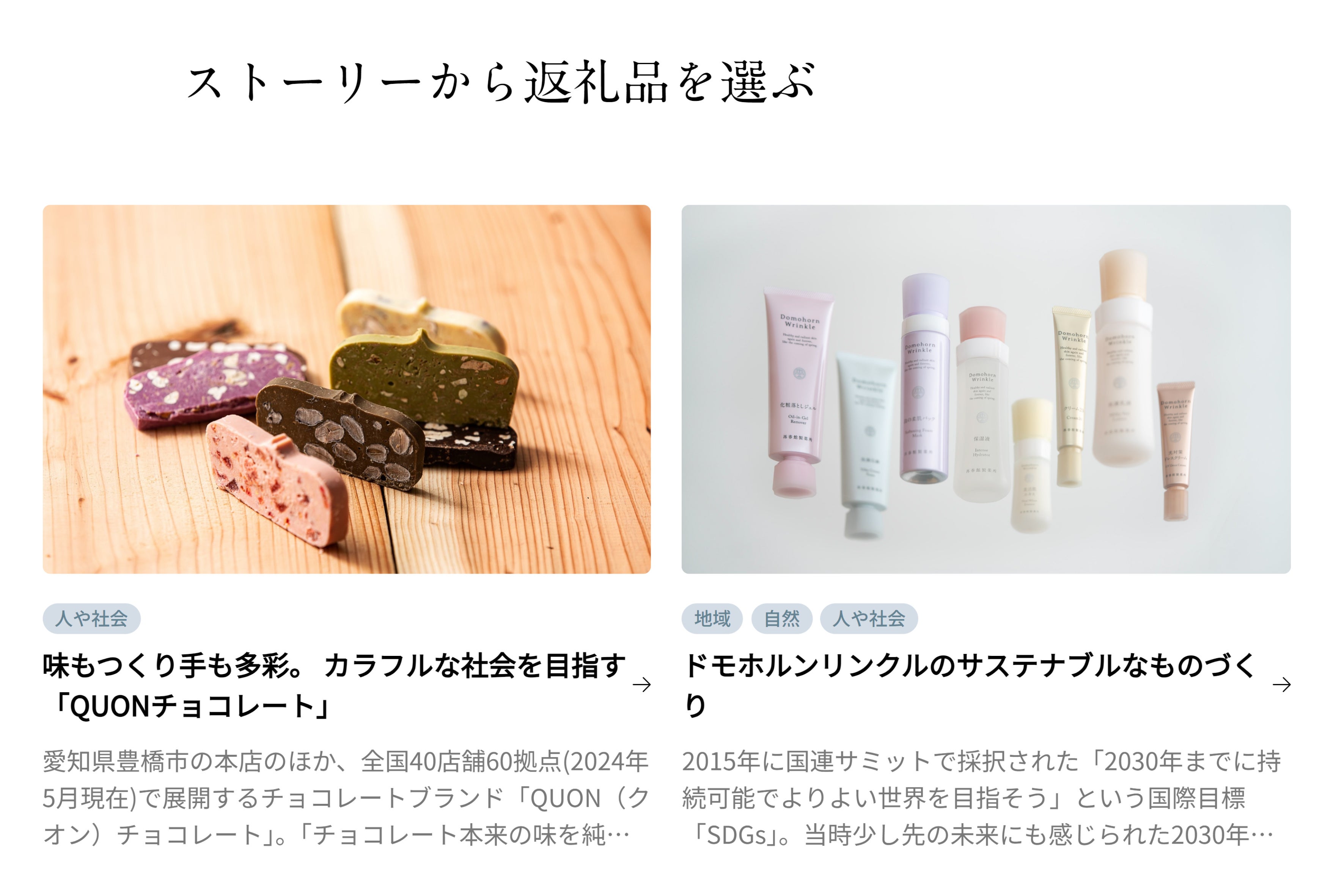 また、返礼品の背景を伝える要素として、新たに「ストーリーから返礼品を選ぶ」機能を追加いたしました。各返礼品の特集ページから、企業の想いや取り組み・返礼品へのこだわりをご覧いただけます。