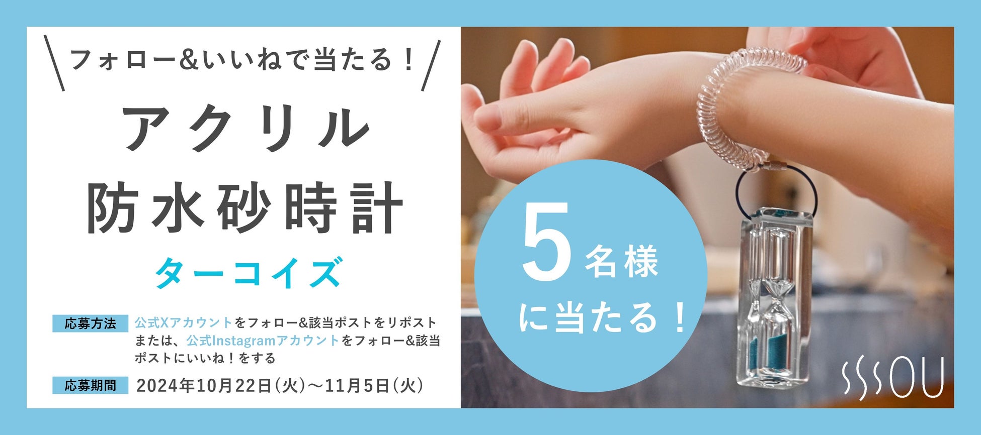 SOUの初出店を記念して、公式Xアカウントと公式Instagramアカウントにて、アクリル防水砂時計(ターコイズ)のプレゼント企画を実施します。