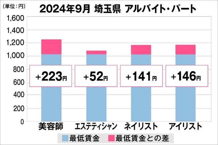 2024年9月時点で『美プロ』に掲載されている「埼玉県」の「美容師・エステティシャン・ネイリスト・アイリスト」求人における「正社員」「アルバイト・パート」の給料を抽出。