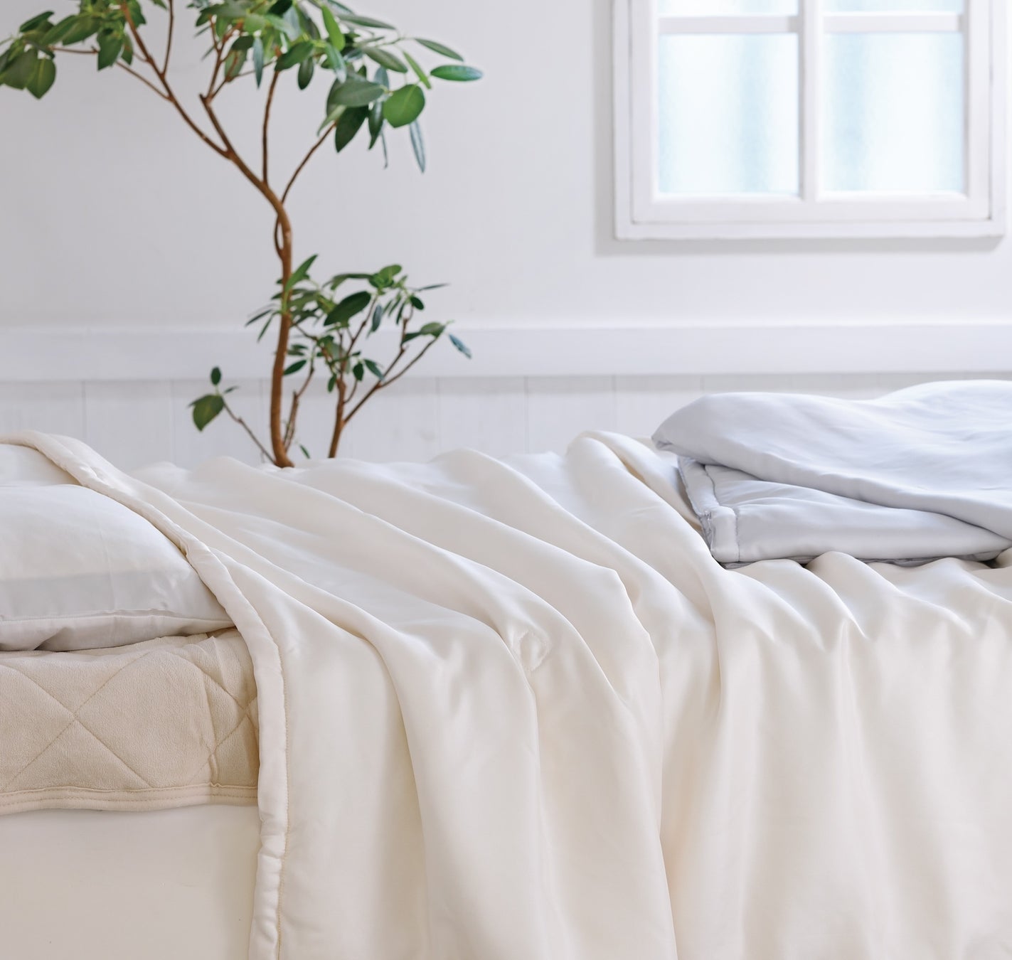 人間の肌に一番近い天然繊維と言われるシルクの掛けふとん。季節の変わり目の気象変化にも対応できる、あると嬉しい一枚です。