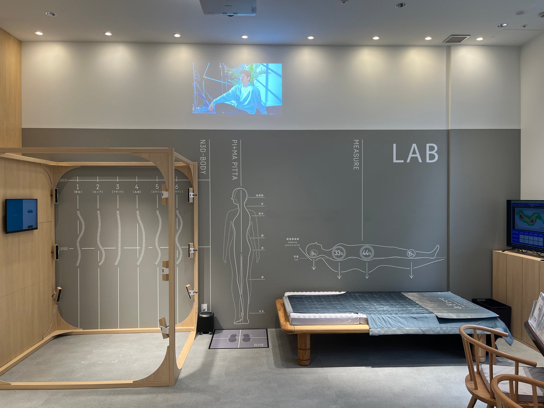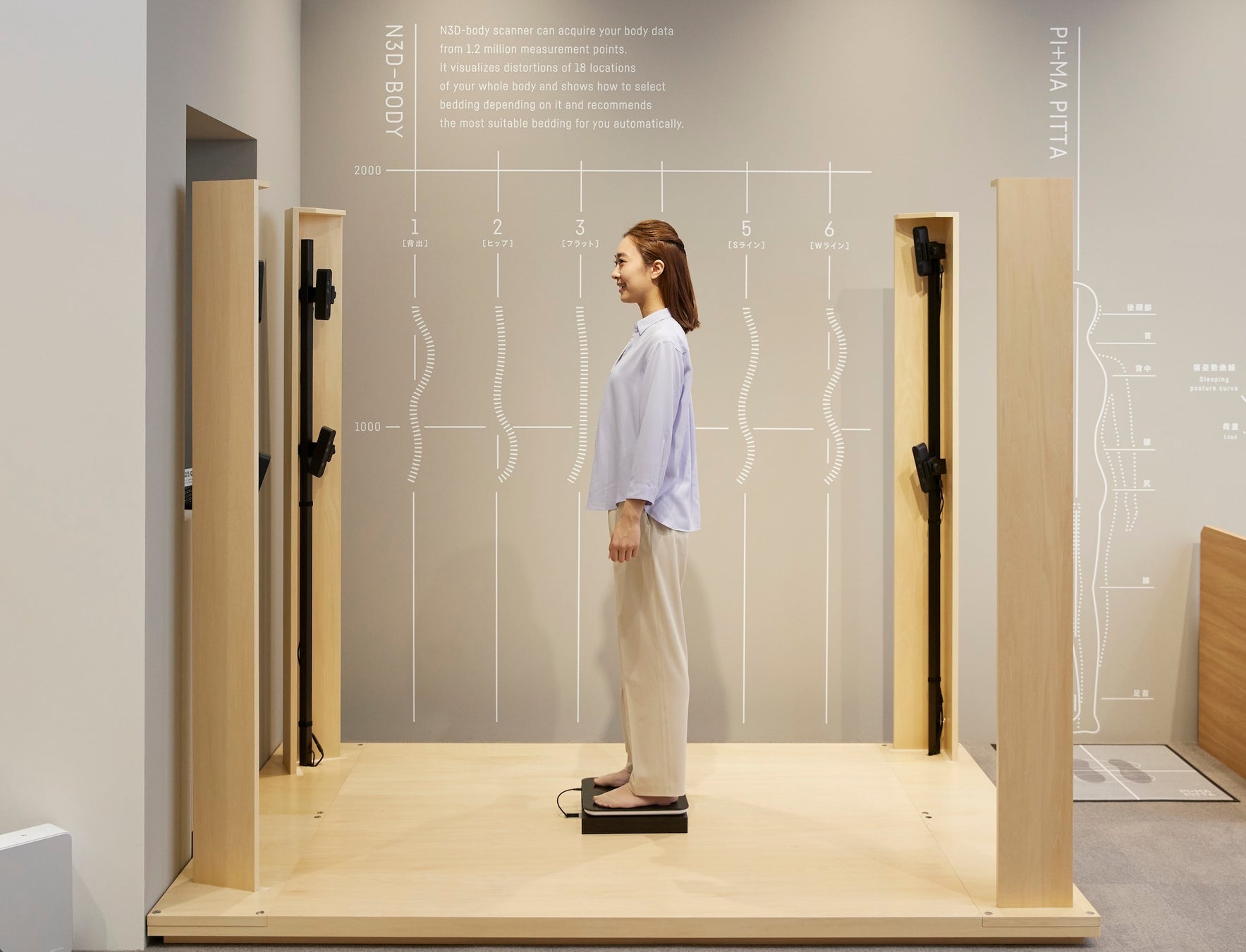 3Dボディスキャナーで全身を測定し、体の骨格や歪みなどを可視化。データに基づき、体型に合った寝具を提案。