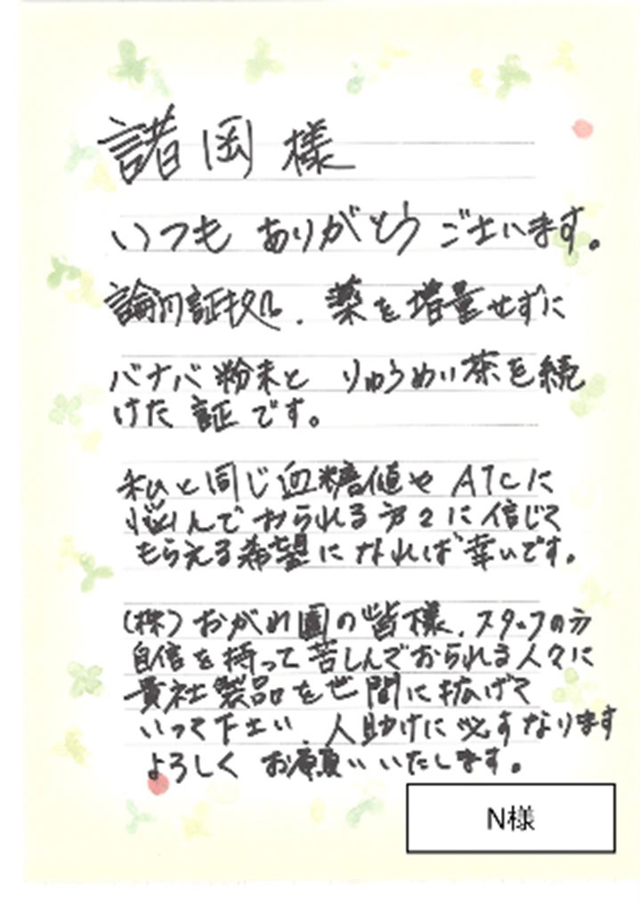 当社のお茶を継続的にお飲みいただいたことで、それらの数値が下がったことを、実際の検査結果のお写真も添えてお手紙で送ってくださいました。