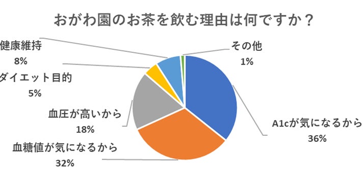 そんな当社のお茶を飲み始めるようなきっかけを聞いてみたところ、「A1cが気になるから」(36%)、「血糖値が気になるから」(32%)、「血圧が高いから」(18%)が上位3つを占めました。