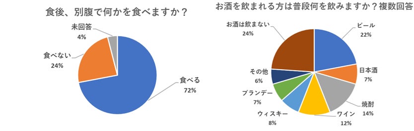 食後、別腹でまた何か食べると回答した方は全体の72%、普段お酒を飲まれる方は76%でした。