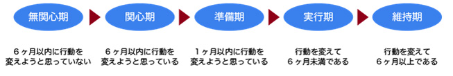 1980年代前半に禁煙の研究から導かれ、その後一般的な理論として定着した行動変容ステージモデルによると、人が行動を変える場合は「無関心期」→「関心期」→「準備期」→「実行期」→「維持期」の5つのステージを通ると考えます(5)。行動変容のステージをひとつでも先に進むには、その人が今どのステージにいるかを把握し、それぞれのステージに合わせた働きかけが必要になります。