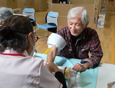 今回の活動は、能登半島地震発生以降3回目の開催でしたが、豪雨などの重なる災害での疲労や、長引く避難所生活や仮設住宅生活、また仮設住宅から再度避難所生活に戻るといった被災者の心の負担を少しでも和らげたいと考え、当社が設立した一般社団法人日本介護美容セラピスト協会のビューティタッチセラピストと北陸地域のナリス化粧品販売員の有志の参加で被災者のケアに当たりました。サービスを受けた被災者からは、「話を聞いてもらえるだけでも、少し落ち着けた」「豪雨で流れ込んだ自宅の土砂を掻き出してきたので、マッサージが気持ちよかった」といった声が聞けました。