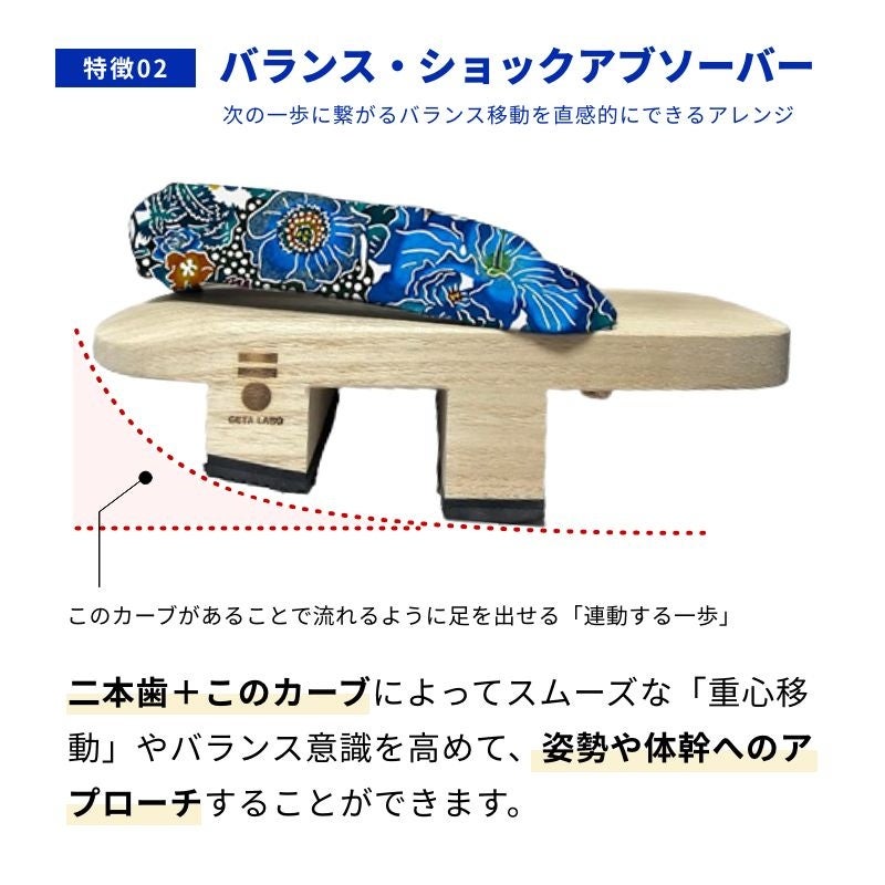下駄という日本の伝統的な履物に現代科学の視点を取り入れた「バランス下駄」は、歩行時の姿勢や体幹を支える効果が期待されるプロダクトです。健康促進を目的に、感覚とエビデンスを融合させたデザインと構造に改良を加え、誰もが自分らしい歩行を楽しみながら、身体的な健康を維持できるようサポートしています。GETA LABOは、単なる履物としての枠を超え、日々の生活の中で活用できるツールとして、多くの方々に親しまれています。