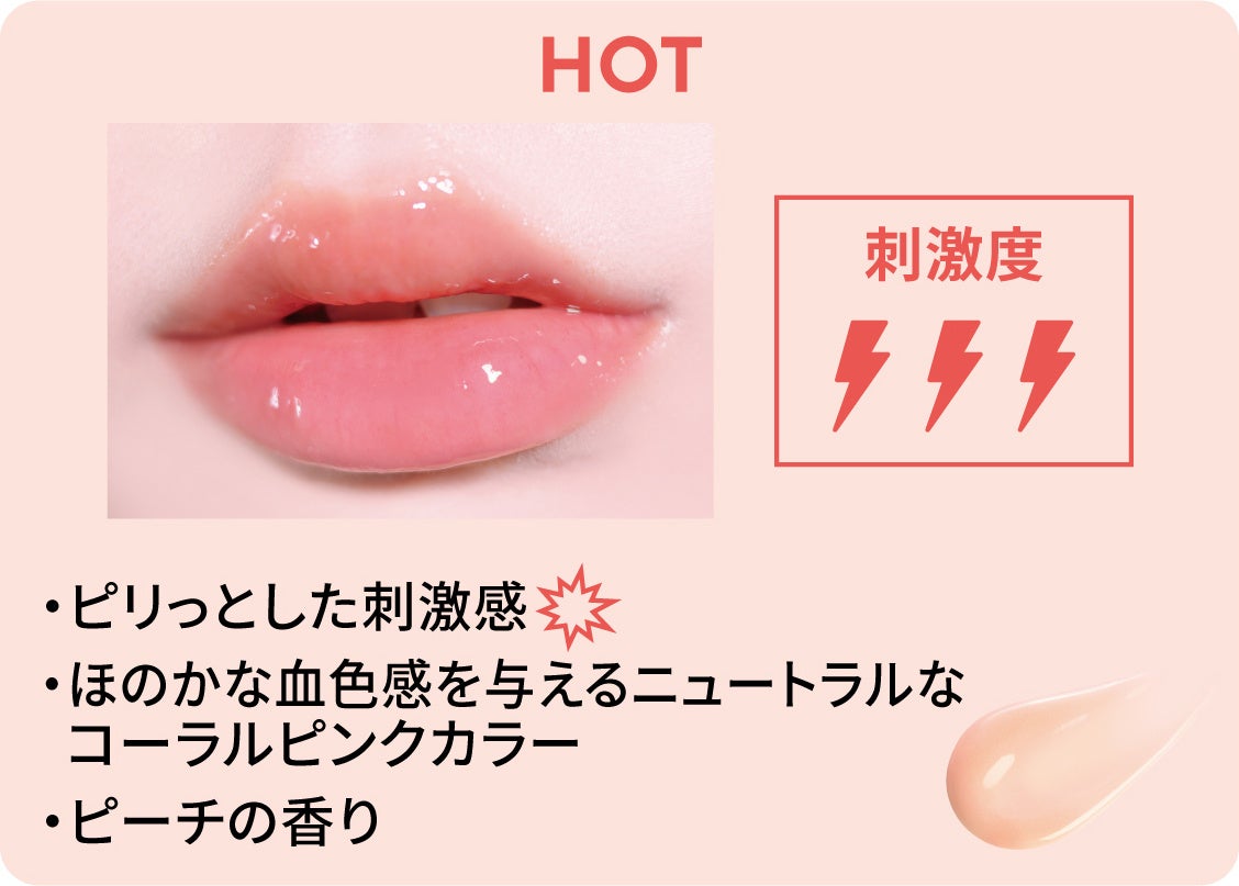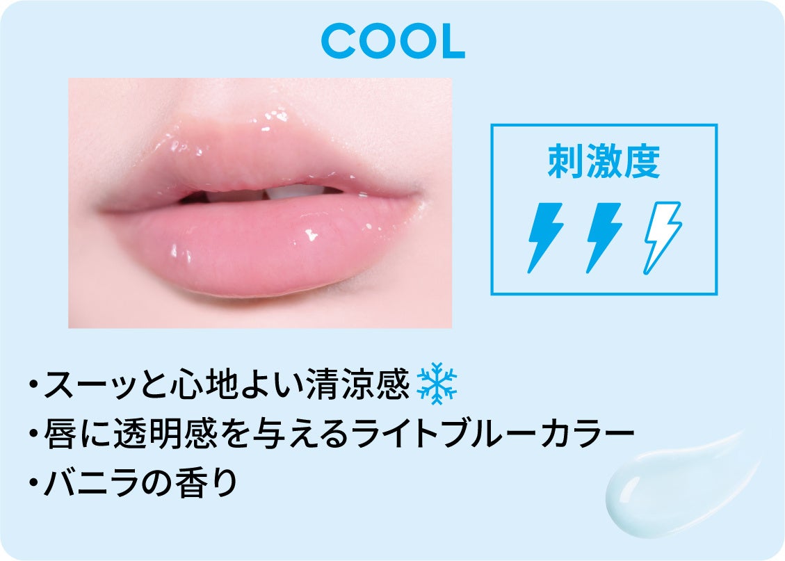 HOT/COOLの2タイプから好みの使用感をお選びいただけます。自然に馴染む透明感のある発色です。