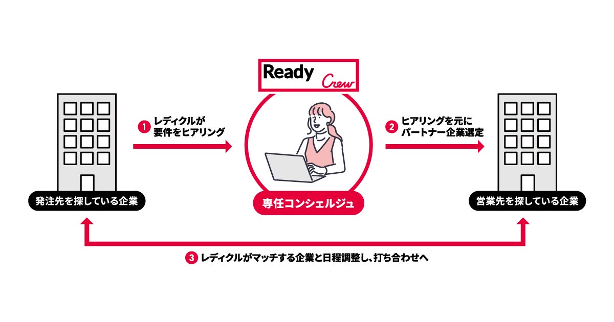 レディクルは、上場企業2,800社の利用実績がある企業と企業をつなぐビジネスマッチングエージェントです。高い傾聴力・提案力を併せ持つコンシェルジュが、システム、プロモーション他、企業のあらゆる発注業務を効率化するために悩みをヒアリングいたします。伺った内容を元に、レディクル独自のシステムで幅広いネットワークの中から最適な企業をご紹介いたします。受注先のパートナー企業様からのみ費用を頂いており、発注元の企業様からは一切費用を頂いておりません。