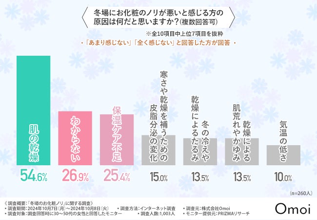 今回の調査で、約7割の方が冬場にお化粧ノリが悪くなると感じていることが明らかになりました。