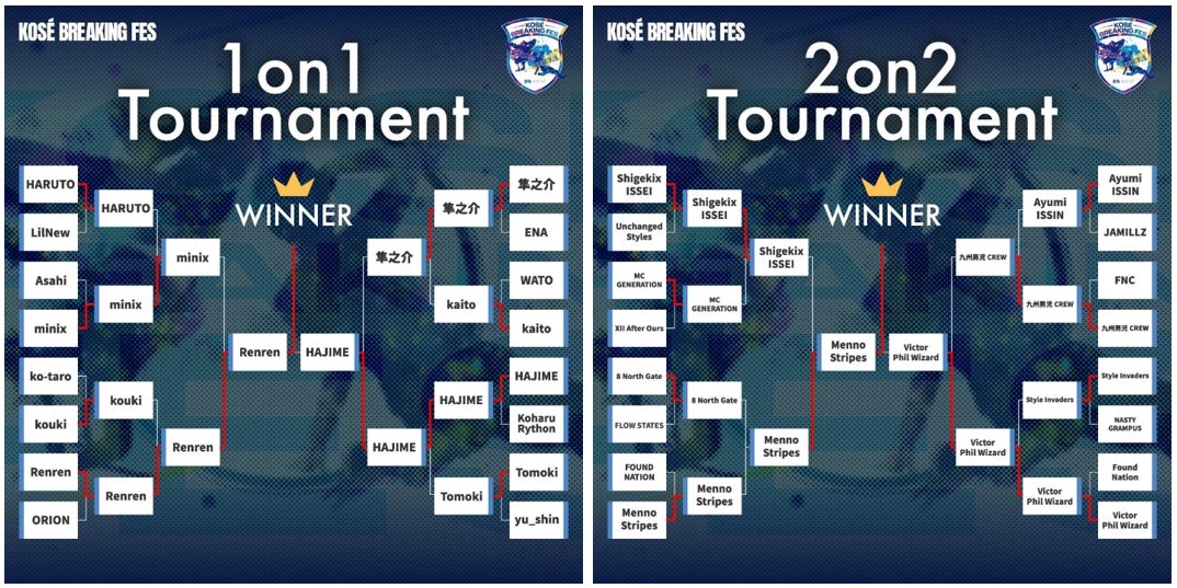 本大会では、高校生以上が参加できる「2on2」部門、中学生以下が参加できる「1on1」部門を用意。「2on2」部門にはゲストダンサーとして、日本を代表するブレイクダンサーのShigekixやISSEIが、海外からは世界ランキング上位でメダリストでもあるPhil WizardやVictorといった著名なブレイクダンサーが出場し、世界トップレベルの対決を繰り広げました。「2on2」部門ではShigekix&ISSEI VS Menno&Stripes、Taichi&YU-KI VS Victor&Phil Wizardといったここでしか見られないバトルも。全員がダイナミックでスキルフルなダンスパフォーマンスを繰り広げました。「1on1」ではRenren、「2on2」部門ではMenno&Stripesが優勝。表彰式では、Menno&Stripesが「すごいラインアップで日本に来られて、この素敵なオーガナイゼーションと、主催と、皆さんの反応が素晴らしかったです」、チェアマンのDRAGONが「なかなか見ることができない有名選手たちを前に、子どもたちの表情が本当にキラキラしていて。彼らがこれからのブレイキンを担ってくれると思います」と嬉しそうに語りました。