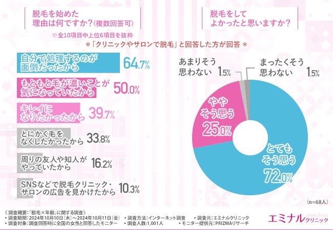 このような高い満足度は、脱毛施術を受けることで体毛に関する悩みや事故処理の手間から解放され、生活の質を向上させる一因であることを示しているのではないでしょうか。