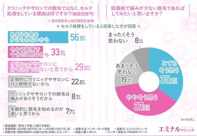 セルフ処理をしていると回答した方に「クリニックやサロンでの脱毛ではなく、セルフ処理をしている理由は何ですか?(複数回答可)」と質問したところ、『あまりお金をかけられないから(56.9%)』と回答した方が最も多く、次いで『セルフ処理で十分だと思うから(33.1%)』『クリニックやサロンに行くほどではないと思うから(29.8%)』となりました。