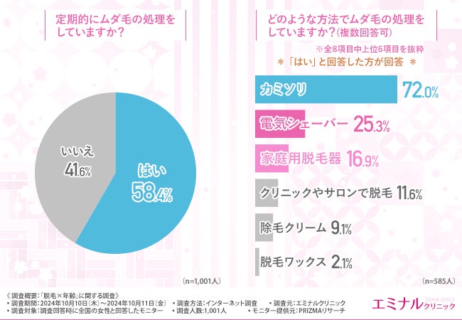 今回の調査で、定期的に脱毛を行う女性の7割以上が、カミソリを使用してムダ毛を処理していることが明らかになりました。
