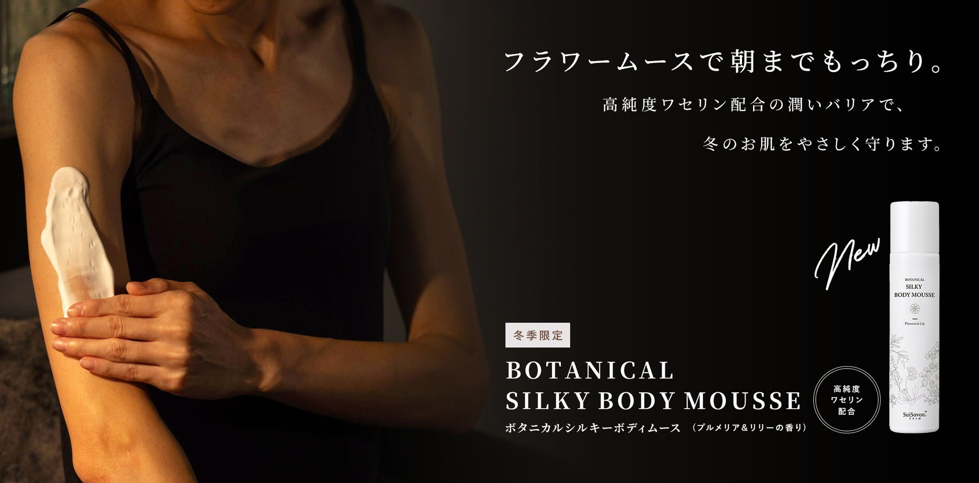 今回発売する『ボタニカルシルキーボディムース (プルメリア&リリーの香り)』は、高純度ワセリン配合の潤いバリアで、冬のお肌をやさしく守ります。ふんわりとキメ細かい「フラワームース」は、お肌にしゅわっと溶け込み、毎日のボディケアを特別な時間にします。
