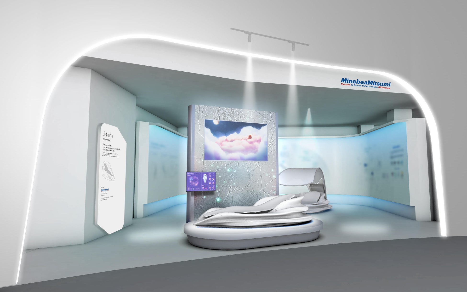 パビリオン「PASONA NATUREVERSE」では、「からだ・こころ・きずな」をテーマに様々な展示を行ってまいります。「からだゾーン」における展示の一つとして、パビリオンの展示協賛パートナーであるミネベアミツミと共同で、『未来の眠り』に関する展示を行います。