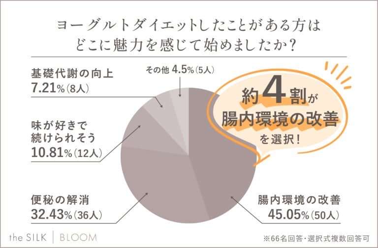 約4割の方が「腸内環境の改善」に魅力を感じてヨーグルトダイエットを始めたと回答しています。