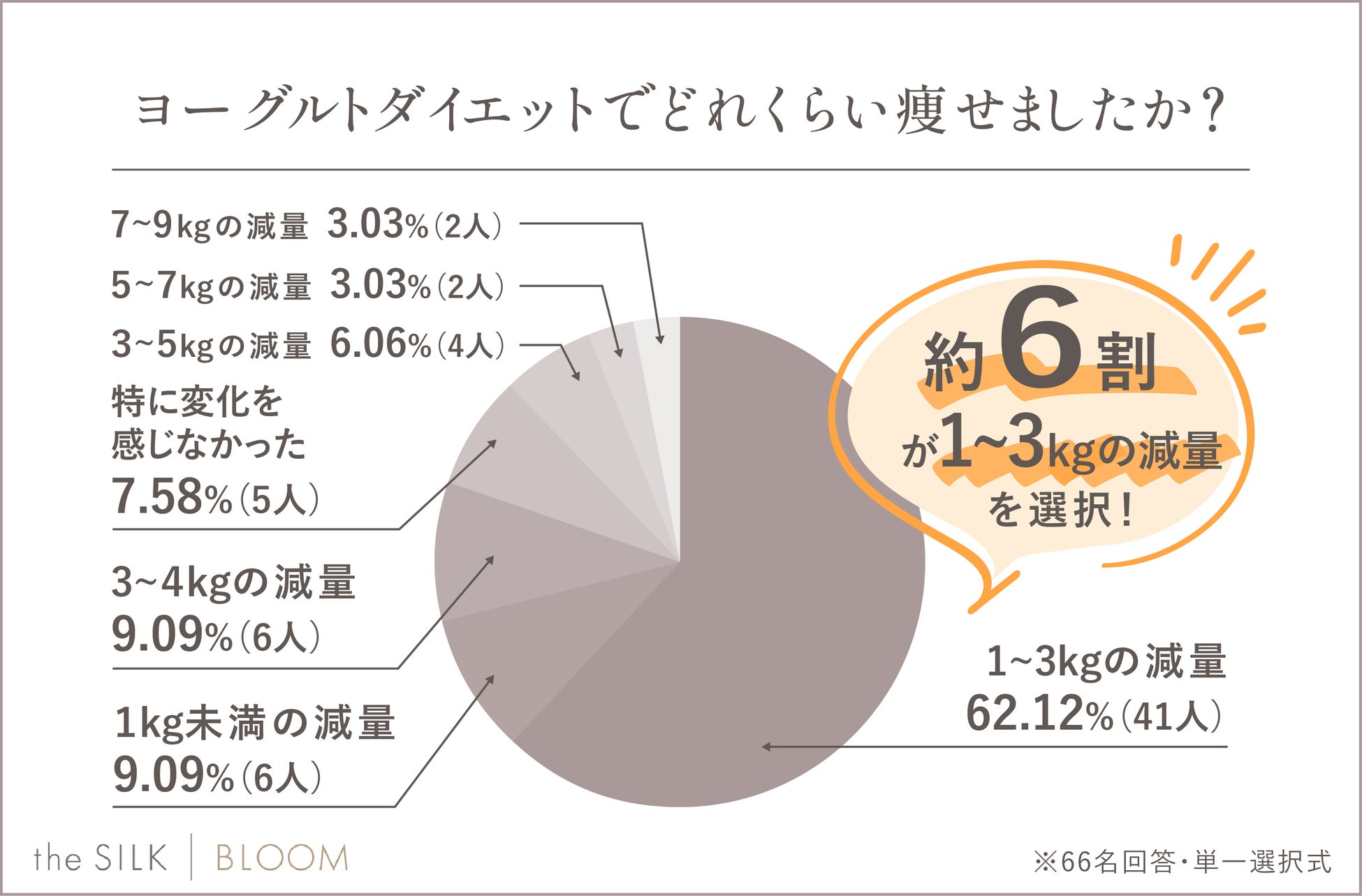 ヨーグルトダイエットを行った66名のうち約6割が1〜3kgの減量を実感しており、中には7〜9kgもの減量に成功したという人も!
