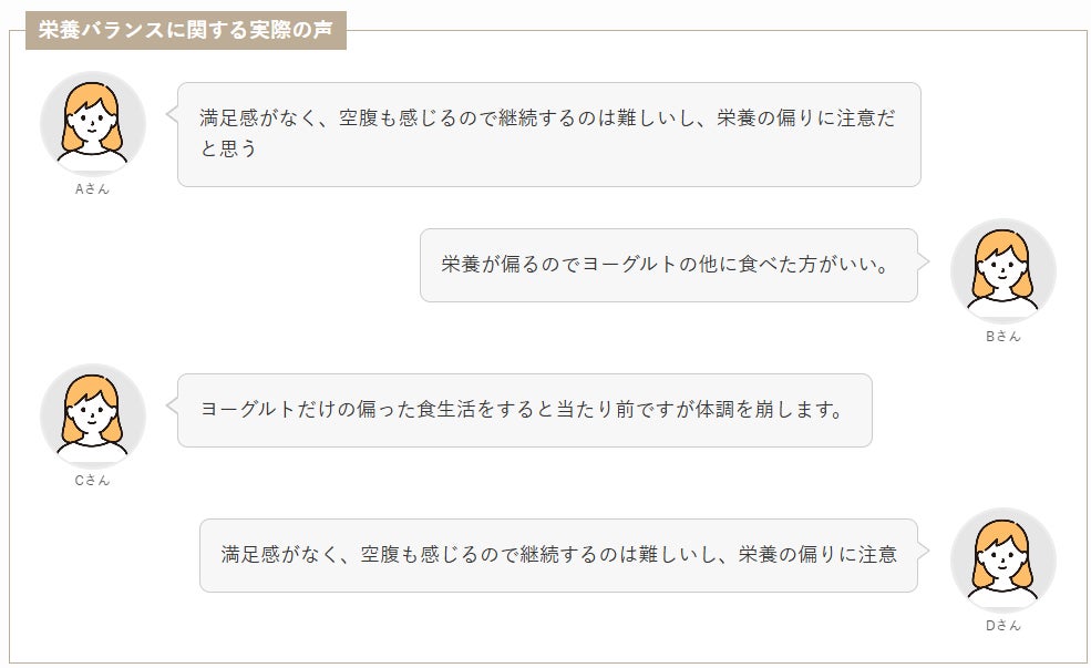 今回のアンケート調査でも、実際のヨーグルトダイエット経験者の方が以下のように注意を促しています。
