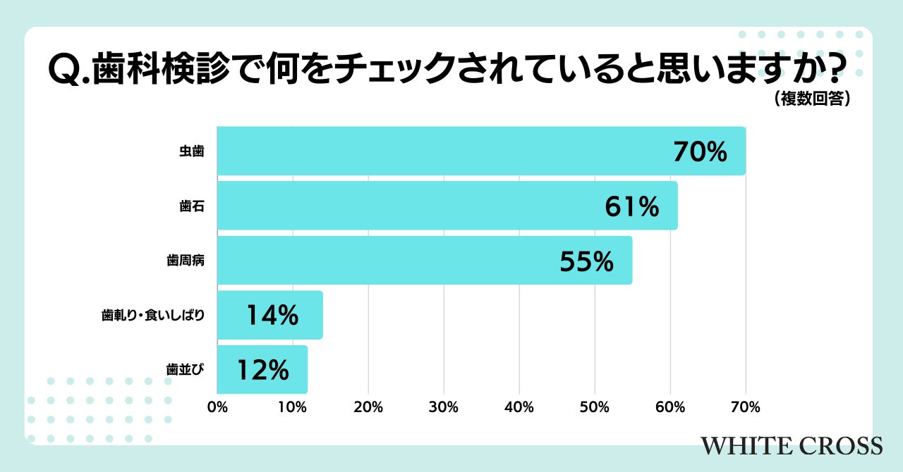 「歯科健診で何をチェックしてもらえるか?」という検診内容の認知では、虫歯が70%、歯周病が61%と高く、それ以外の検査項目については認知が低いことが分かりました。