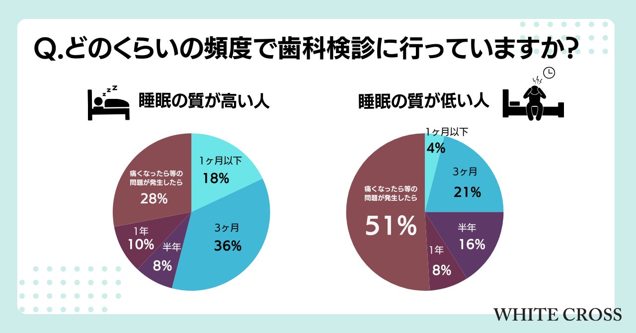 今回の調査では睡眠の質が高いと感じている人と、低いと感じている人とでは、歯科検診の頻度に差があることが明らかになりました。睡眠の質が高いと感じている人のうち50%以上の方が3ヶ月以下の頻度で検診を受けており、睡眠の質が低いと感じている人は3ヶ月以下の検診頻度は25%に留まりました。