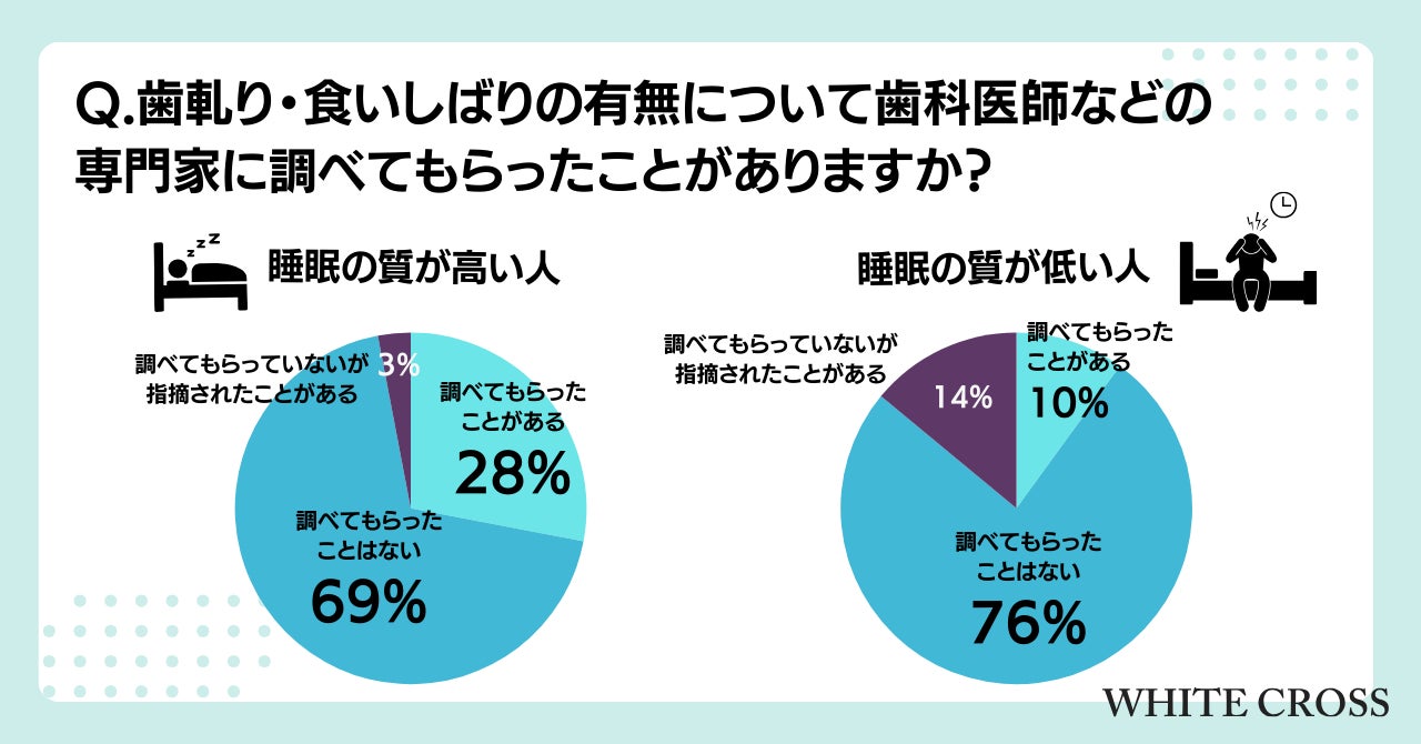 また、歯軋りや食いしばりは本人が自覚することが難しいため、歯科医師などの専門家を受診することが望ましいです。実際に専門家に調べてもらったことがあるかを聞いた設問では、自身の睡眠の質が高いと感じている人は28%、低いと感じている人では10%。ここでも大きな差が出ました。