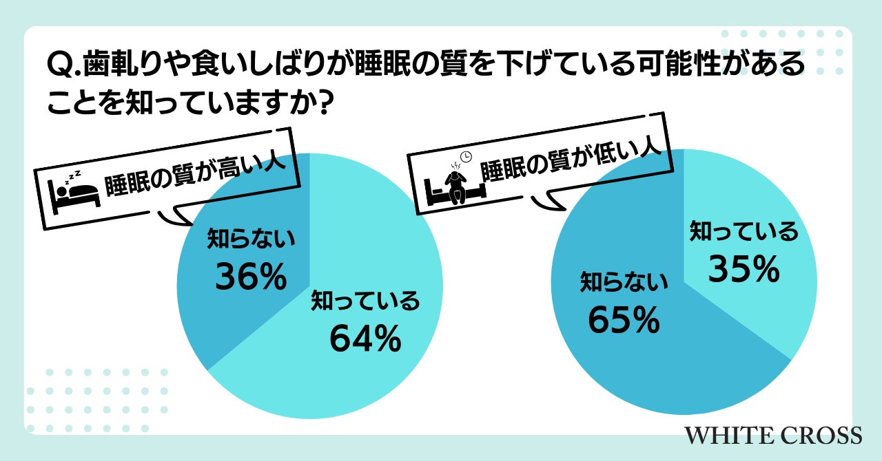 歯軋りや食いしばりは睡眠の質と関連する可能性があることを知っている人は、自身の睡眠の質が高いと感じている人では64%、低いと感じている人では35%と大きな差が出ました。