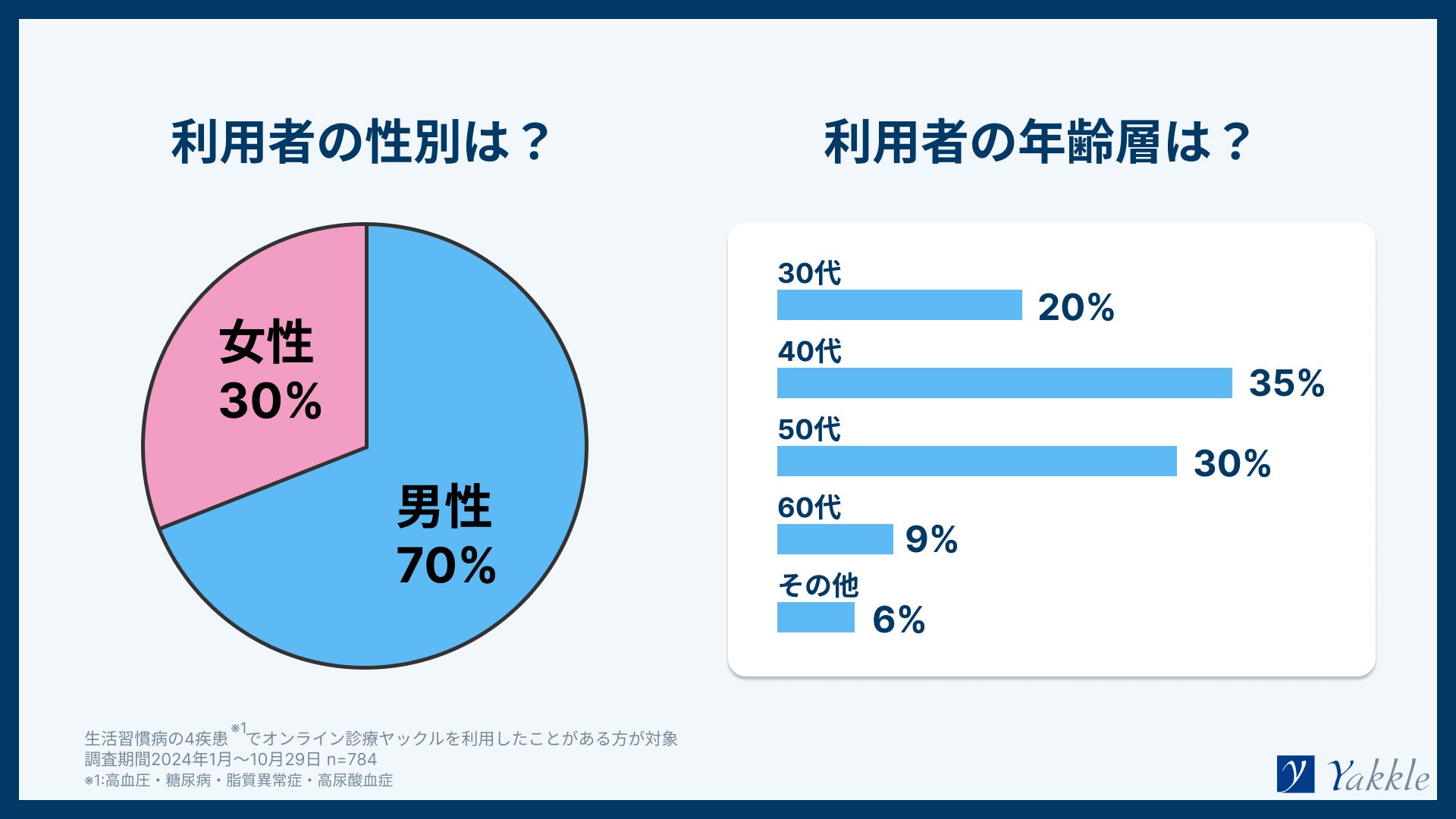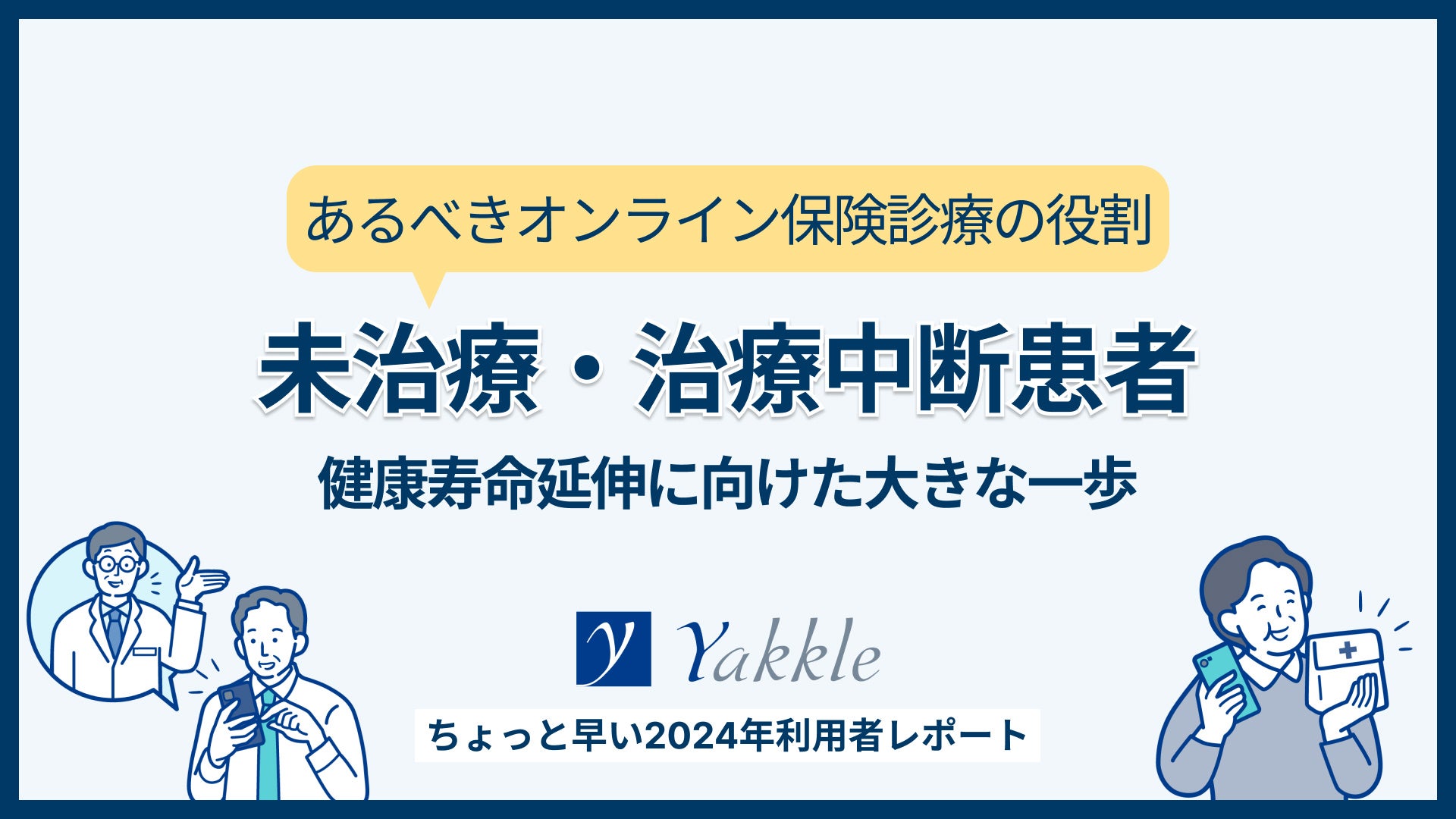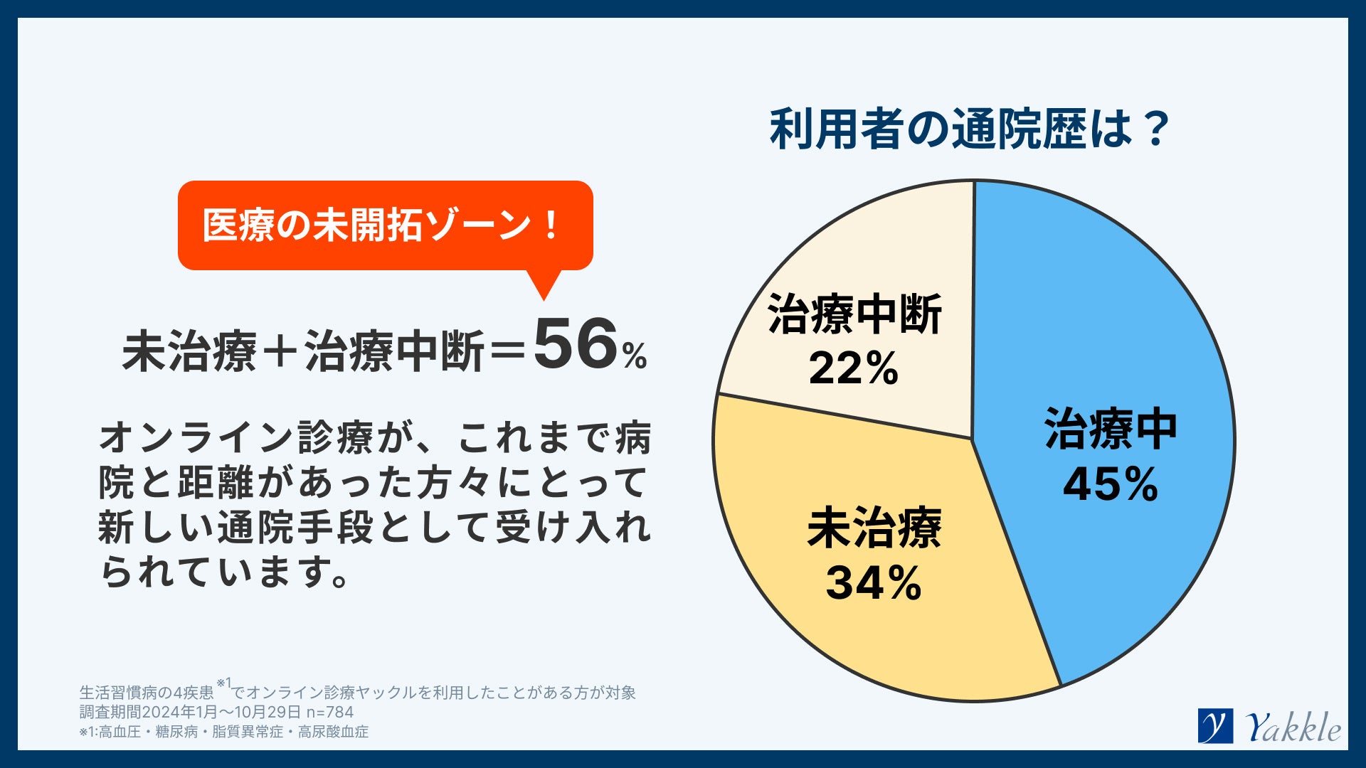 特に、未治療の方の利用も多く「これから治療を始めたい」と思ったタイミングでオンライン保険診療を選ぶケースが見受けられます。また、治療を中断した方にとっても、オンライン保険診療が再び治療を開始するきっかけとなっています。ヤックルは、オンライン診療を活用し保険医療を身近にすることで、治療を続けるべき人が続けられるあるべき医療を届けます。その結果、生活習慣病患者が健康管理に取り組みやすい環境を提供しています。