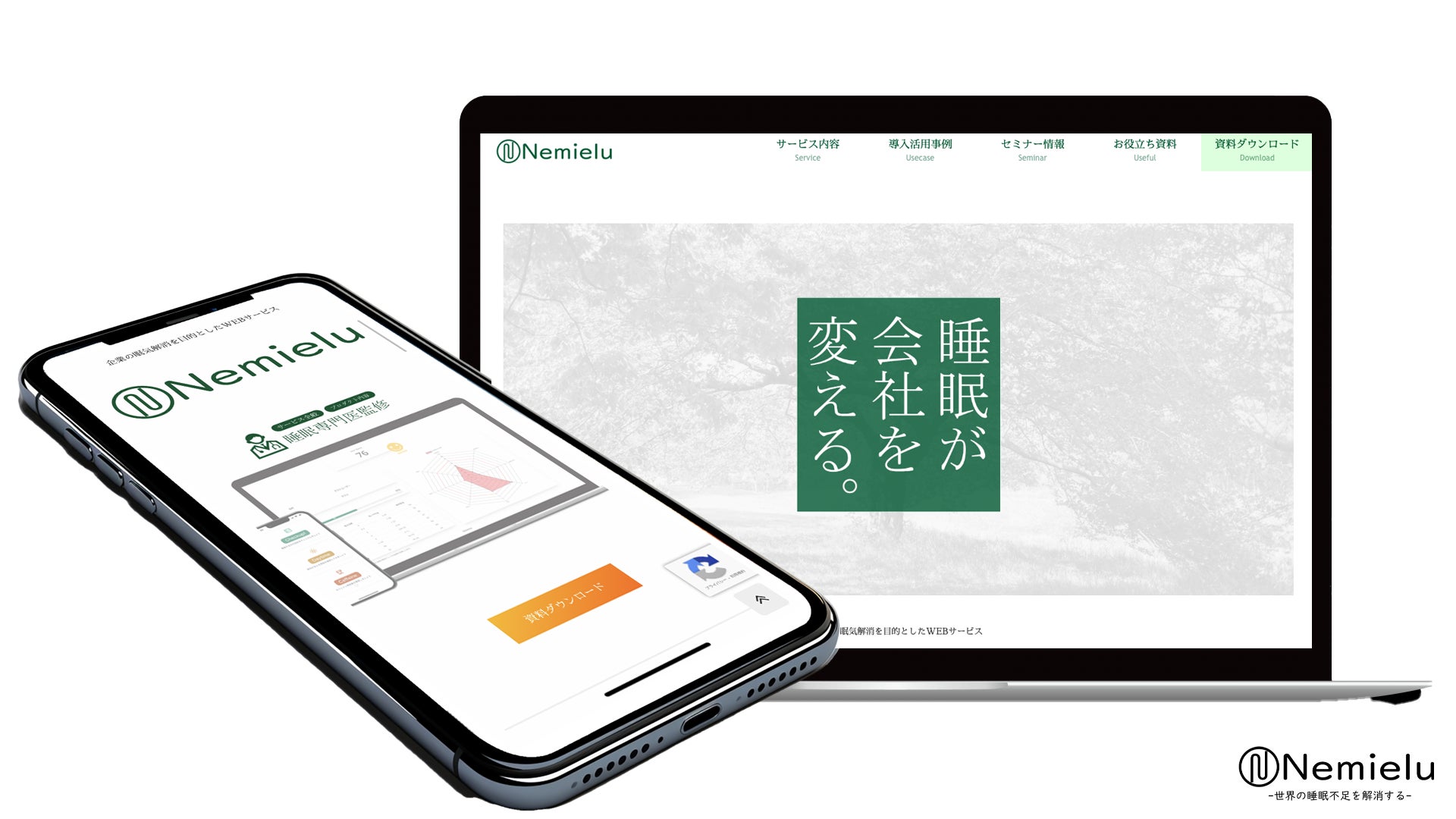 Nemielu導入のメリットを少しでも広めるべく、導入企業のご担当者様へのインタビューや、より睡眠に対する興味関心を惹くためにウェビナーの開催を進めて参りました。サービスサイトでは、サービス内容だけでなく、このような活動をサイト訪問していただいた方に余すことなくお伝えしたいという想いから、この度サービスサイトをリニューアルオープンいたしました。また、Nemieluは企業向けのサービスであり、企業として健康経営、ウェルビーイング経営や人事戦略として活用いただけることをよりメッセージとしてお伝えすべく、「睡眠が会社を変える。」をキャッチフレーズとしています。