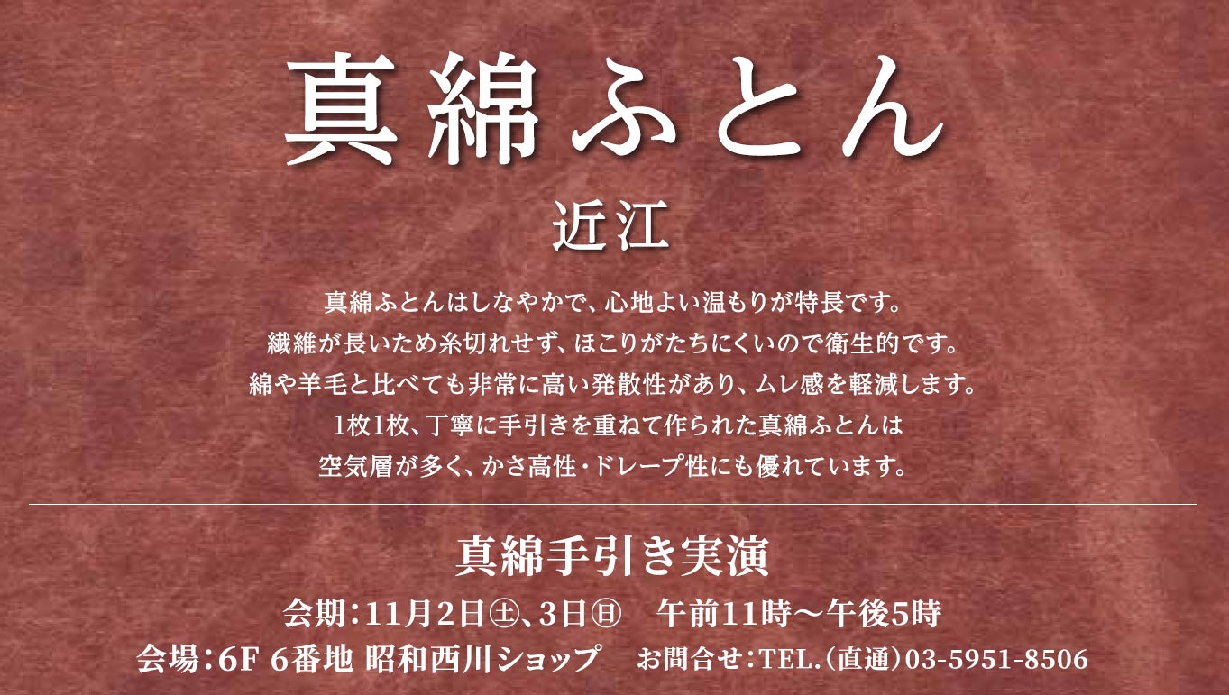 MuAtsu(ムアツ)を中心に様々な寝具を手がける昭和西川株式会社(所在地:東京都中央区、代表:西川惠)は、11月2日(土)、3日(日)東武百貨店 池袋本店で真わたふとん手引き実演会を開催いたします。
